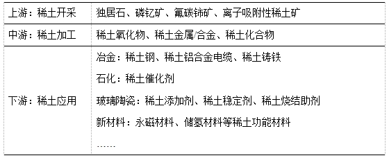 稀土產(chǎn)業(yè)鏈主要由稀土資源開采,稀土材料制備,以及稀土應(yīng)用領(lǐng)域構(gòu)成。其中:稀土資源開采主要涉及的稀土礦物有氟碳鈰礦、獨居石、磷釔礦,以及離子吸附性稀土礦;稀土材料制備包括精礦分解以及冶煉;稀土應(yīng)用領(lǐng)域包括冶金、軍事、石化、玻璃陶瓷、農(nóng)業(yè)、新材料等領(lǐng)域,是我國關(guān)鍵的戰(zhàn)略性資源。