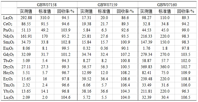 參考《GB/T 40798 離子型稀土原礦化學(xué)分析方法 稀土總量的測定 電感耦合等離子體質(zhì)譜法》,采用氫氟酸、硝酸、高氯酸進行濕法消解。利用碰撞反應(yīng)模式控制氧化物產(chǎn)率,降低輕稀土氧化物/氫氧化物對其他稀土元素的干擾;并根據(jù)實際樣品中元素含量,校準稀土氧化物/氫氧化物的干擾。對三個稀土礦標準物質(zhì)中14種稀土元素(以氧化物形式表示)進行測試,各元素回收率為86.6 %~109.9%。