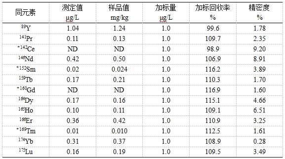 參考《GB/T 18115.1-2020 稀土金屬及其氧化物中稀土雜質(zhì)化學(xué)分析方法 第1部分:鑭中鈰、鐠、釹、釤、銪、釓、鋱、鏑、鈥、餌、銩、鐿、镥和釔量的測定》,將高純氧化鑭用稀硝酸溶解,利用內(nèi)標法進行校正。考察加標回收率及精密度。方法加標回收率為98.9%~116.9%,精密度為0.28%~9.20%。