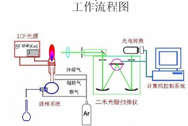 溶液進入等離子體光源中受激發(fā),釋放出光子,形成該元素的特性譜線,譜線的強度和蒸汽中原子的濃度成正比,進行定量測定。