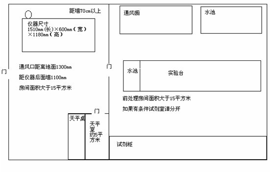 ICP-2000型ICP掃描光譜儀的外形尺寸為1510mm(長)×600mm(寬)×1180mm(高),重量為300kg ,發(fā)貨時四角裝有減震器,儀器運到用戶后卸下減震器,換上螺絲桿,當儀器選好位置后,將螺絲桿旋出使四角輪懸空,調節(jié)螺絲桿使儀器至水平,為保持儀器性能穩(wěn)定及便于維護,ICP-2000 周圍必須留出供維護人員維護儀器所需的空間(安裝臺距后面墻面至少70cm)