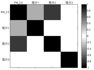 圖5 EHM-X200大氣重金屬監(jiān)測儀監(jiān)測數(shù)據(jù)各組分與PM2.5的相關(guān)性。圖例中顏色的深淺表示相關(guān)性數(shù)值的大小。組分2與PM2.5的相關(guān)性強,這說明影響該地區(qū)PM2.5濃度的主要污染源為冶金工業(yè)廢氣。