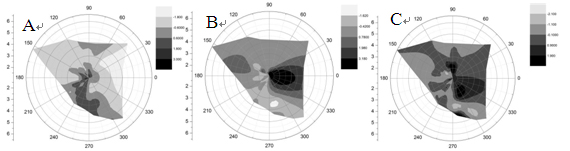 圖6 EHM-X200大氣重金屬監(jiān)測儀監(jiān)測數(shù)據(jù)PM2.5中元素主成分分析得到的各組分與風向關(guān)系圖。圖A是組分1(工業(yè)、生活燃料燃燒)的濃度與風向關(guān)系圖,從圖中可以看出組分1主要來源于監(jiān)測點位的西南方向(深色區(qū)域);圖B是組分2(冶金工業(yè)廢氣)的濃度與風向關(guān)系圖,從圖中可以看出組分2來源于監(jiān)測點自身范圍內(nèi)(深色區(qū)域);圖C是組分3(揚塵)的濃度與風向關(guān)系圖,從圖中可以看出組分3主要來源于監(jiān)測點位的東方及北方(深色區(qū)域)。圖中顏色深淺由淺到深代表污染的程度由小到大。