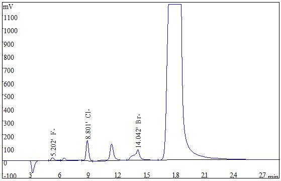 準確稱取0.2g(精確至0.0001g)試樣,采用氧彈燃燒后冷卻定容,經0.22μm的水系濾膜過濾后上機得到測試譜圖如下圖2、圖3所示。
