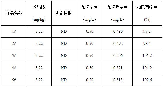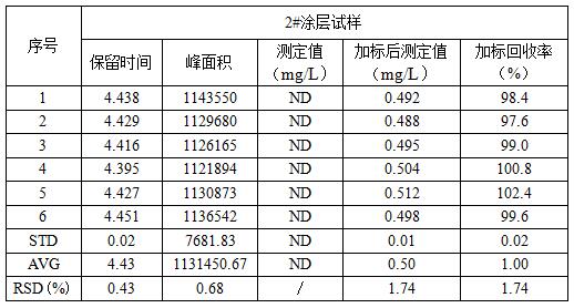 隨機(jī)抽取2#涂層試樣進(jìn)行加標(biāo)0.5mg/L重復(fù)測(cè)定6次,考察了保留時(shí)間、峰面積的重復(fù)性及加標(biāo)回收率,其中保留時(shí)間的重復(fù)性(RSD)為0.43%,峰面積的重復(fù)性(RSD)為0.68%,加標(biāo)回收率的重復(fù)性(RSD)為1.74%,測(cè)試結(jié)果詳見(jiàn)表3所示。