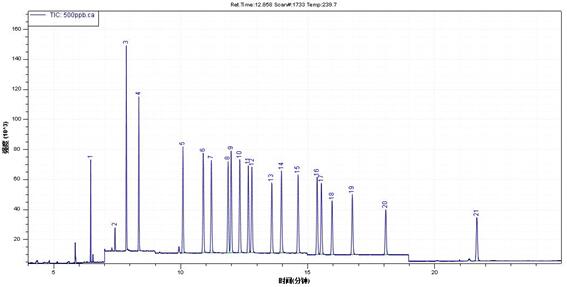 1. 四氯間二甲苯(替代物);2. 蒽-d10(內標物);3. PCB 28;4. PCB 52;5. PCB 101;6. PCB81;7. PCB 77;8. PCB 123;9. PCB 118;10. PCB 114;11. PCB153;12. PCB105;13. PCB 138;14. PCB126;15. PCB167;16. PCB156;17. PCB157;18. PCB180;19. PCB169;20. PCB189;21. PCB 209(內標)
