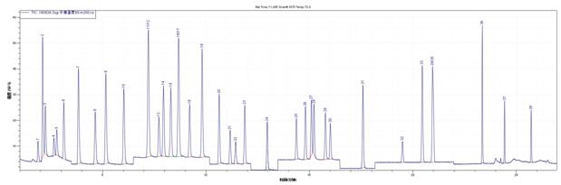 1. α-六六六;2. β-六六六;3. γ-六六六;4. 蒽-D10(內標);5. δ-六六六;6. 七氯;7. 艾氏劑;8. 環(huán)氧七氯B;9. γ-氯丹;10. 硫丹I;11. α-氯丹;12. 4,4'-DDE;13. 狄氏劑; 14. 異狄氏劑;15. 硫丹 II;16. 4,4'- DDD; 17. 異狄氏醛;18. 硫丹硫酸酯;19. 4,4'-DDT;20. 異狄氏酮; 21. 甲氧DDT;22. 苝-D12(替代物);